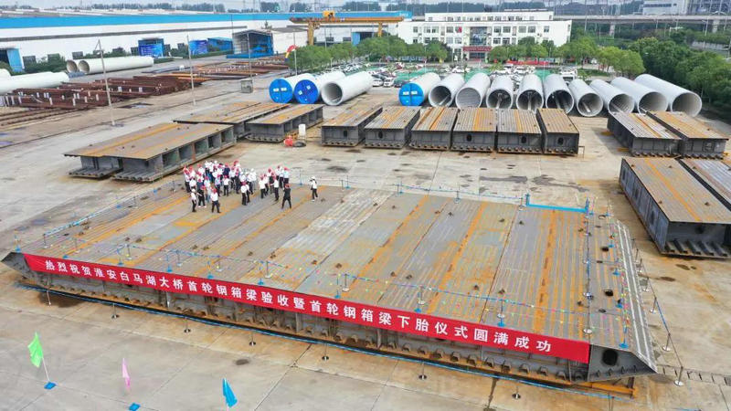 7月3日,隨著現(xiàn)場指揮人員一聲令下,中建安裝集團(tuán)五洲公司(以下簡稱:中建五洲)鋼結(jié)構(gòu)成品車間內(nèi),裝載著重67.6噸、長18米、寬4.1米、高2.5米首輪首節(jié)鋼箱梁的平板車平穩(wěn)駛出總拼車間進(jìn)入涂裝工序,提前50天順利 下胎,標(biāo)志著中建五洲承接的淮安白馬湖大橋建造項(xiàng)目迎來了開門紅。