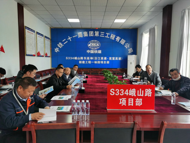 調(diào)研組觀看施工視頻及匯報材料 安徽省交通運輸廳綜合執(zhí)法局公路執(zhí)法處處長黃開元、省公路中心楊彥峰、省交通質(zhì)監(jiān)局水運監(jiān)督處丁濤出席調(diào)研會,蕪湖市交通運輸局黨委委員、副局長沈朝榴、公路管理局黨委書記、局長林春、黨委委員、副局長許帶兵、江南建設(shè)辦主任丁欣、相關(guān)科室負(fù)責(zé)人及S334峨山路項目部負(fù)責(zé)人出席此次調(diào)研活動。