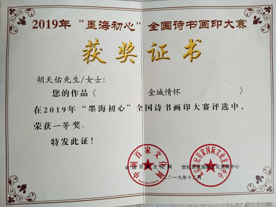 經(jīng)過緊張激烈的角逐,胡天佑作品《金城情懷》喜獲“墨海初心”全國(guó)詩(shī)書畫印大賽一等獎(jiǎng)。