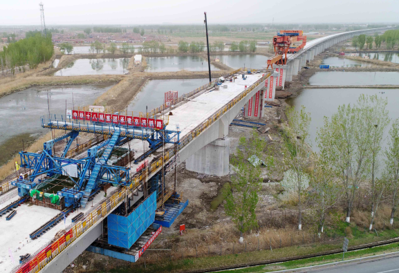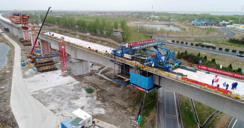 3、4月17日,中鐵十八局集團承建的京濱高鐵北辰特大橋津薊高速九園匝道連續(xù)梁合龍(楊士超 攝)