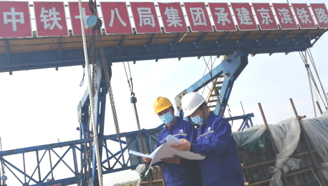 6、4月17日,中鐵十八局集團京濱高鐵二標(biāo)一分部項目總工張守陸、施工隊負責(zé)人吳孝力在研究施工方案(楊士超 攝)