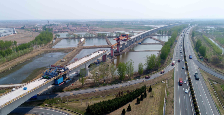 4、4月17日,中鐵十八局集團承建的京濱高鐵北辰特大橋津薊高速九園匝道連續(xù)梁合龍(楊士超 攝)