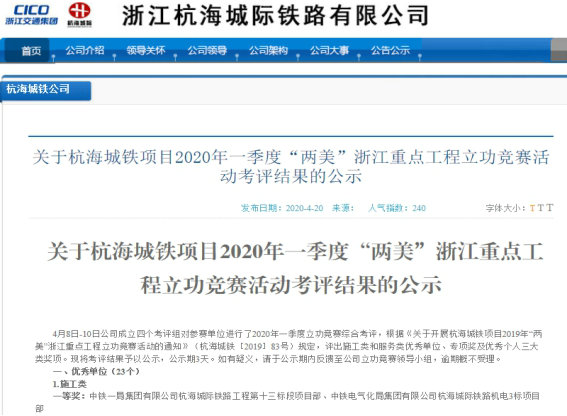 4月24日,從剛剛結束的浙江杭海城際鐵路有限公司2020年一季度暨2019年度“兩美”浙江重點工程立功競賽總結表彰會上獲悉。中鐵一局建安公司杭海城際鐵路項目在此次評比中獲施工類“一等獎”及“特殊貢獻獎”,另有多人獲先進個人稱號。