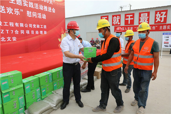活動期間,進(jìn)行了“夏送清涼、送安全、送歡樂”慰問活動,現(xiàn)場與會領(lǐng)導(dǎo)為京德項目職工和一線勞務(wù)工發(fā)放了防暑降溫慰問品,為大家送去了夏日的關(guān)懷和清涼。