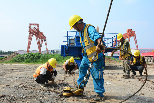 上午7時許,設(shè)備拆解現(xiàn)場總指揮柴兵一聲令下,兩臺大噸位吊車緩緩起鉤,提梁機(jī)主體拆解工作正式拉開序幕。安全員全程盯控,現(xiàn)場指揮與吊車司機(jī)緊密配合,一個小時后1號提梁機(jī)機(jī)臂成功落地。隨后,工作人員頭頂烈日,開始剛?cè)嵬鹊牟鸾夤ぷ?。來自陜西的年輕工友雷人龍抹了把臉上的汗,瞇著眼睛笑著說道,今天要拆上百條螺栓,手上若不戴上工作手套,掌心就會磨脫皮,兩三個小時就要磨爛一雙新手套。渴了,工人們會到旁邊歇幾分鐘,500毫升一瓶的礦泉水,咕咚咕咚兩口就沒了。