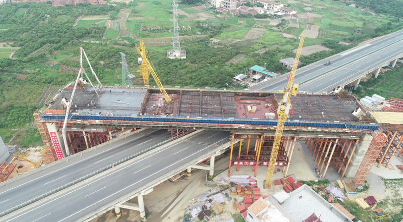 此次合龍段位于梅山特大橋24-25號(hào)墩,采用1-112米提籃拱跨越既有莆永高速公路岐厝高架橋,與高速公路斜交39度,系梁全長(zhǎng)116米,橋面寬19米。