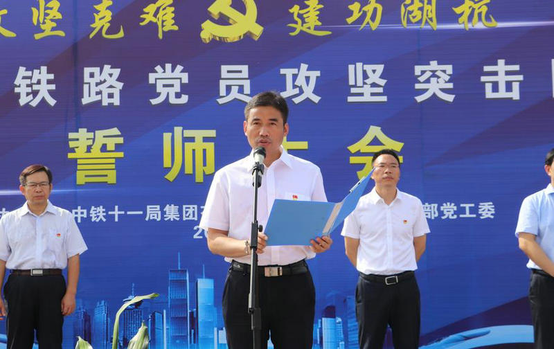 伴隨著現(xiàn)場突擊隊的聲聲誓言,8月20日上午,“攻堅克難,建功湖杭”湖杭鐵路黨員攻堅突擊隊誓師大會在中鐵十一局集團有限公司湖杭鐵路項目龍崗寺大橋區(qū)間路基施工現(xiàn)場舉行。滬昆客專浙江公司,湖杭鐵路有限公司,中鐵十一局集團有限公司等有關(guān)領(lǐng)導(dǎo)出席。