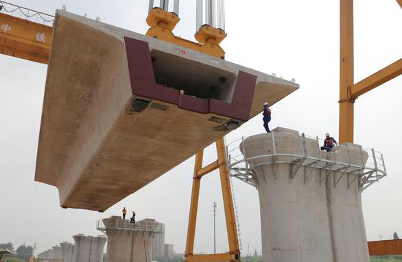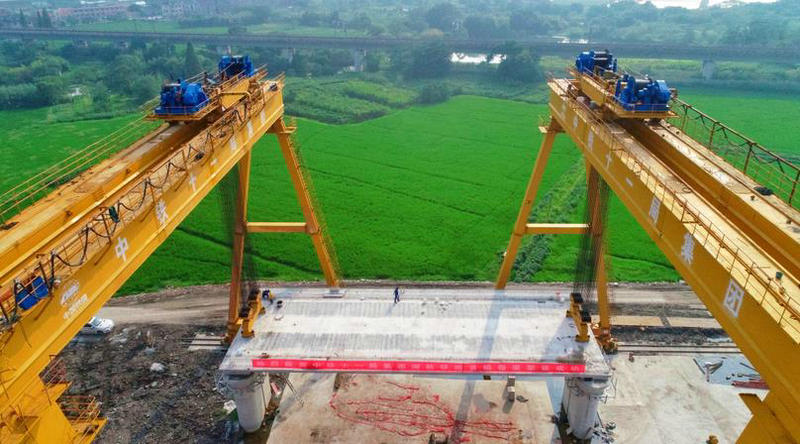 浙江杭州:2020年8月30日上午十一點(diǎn),一片長32.6米,寬12.6米,高3米,重約790噸的預(yù)制箱梁在提梁機(jī)的牽引下,穩(wěn)穩(wěn)落到預(yù)定位置,由中鐵十一局集團(tuán)湖杭鐵路項(xiàng)目承建的余杭特大橋首片預(yù)制箱梁首架取得圓滿成功,標(biāo)志著余杭特大橋正式進(jìn)入上部結(jié)構(gòu)施工階段。