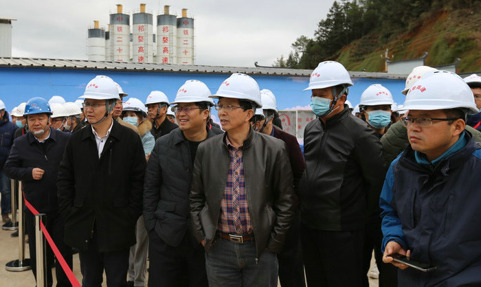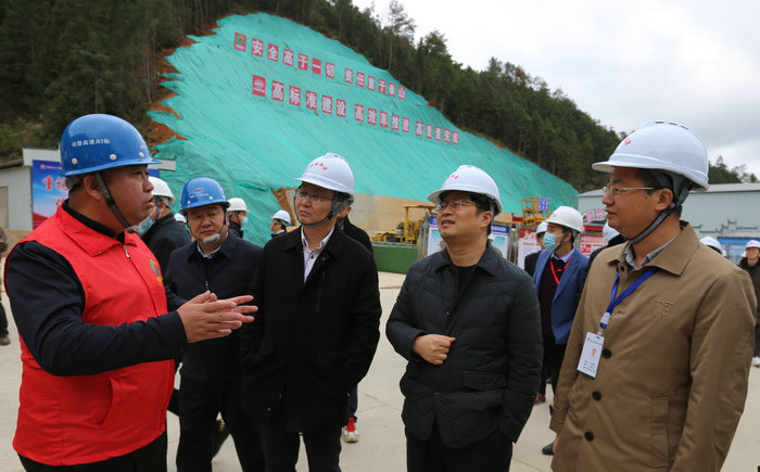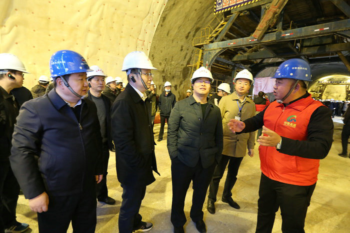 項(xiàng)目負(fù)責(zé)人李蕓(左一)為交通廳副廳長劉震華(中)等領(lǐng)導(dǎo)匯報(bào)隧道施工情況