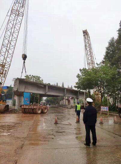 大鯨港鎮(zhèn)大橋橫跨S306省道,省道車流量大,給橋梁架設(shè)施工增加了難度。為解決這一難題,項目部制定了專項施工方案,跨省道搭設(shè)安全防護棚,并與當?shù)亟煌ú块T積極溝通,派路政、交警部門工作人員現(xiàn)場指揮,確保架梁過程平穩(wěn)安全。