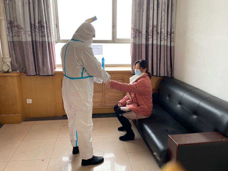 圖為防疫人員為發(fā)熱人員測溫