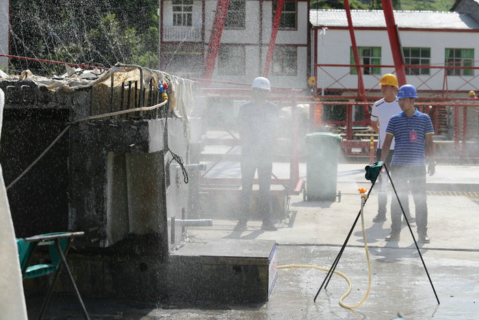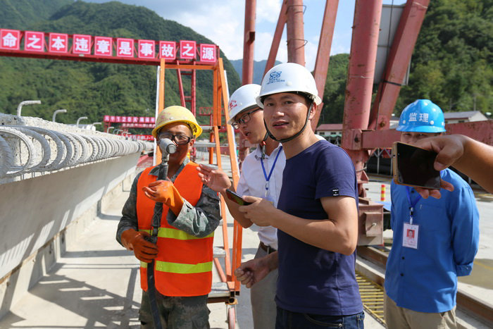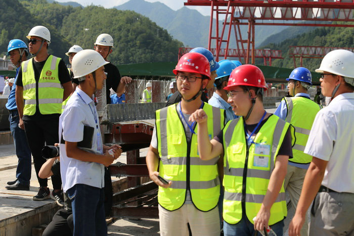 在參觀制梁施工中,盡管氣溫很高,曬得人汗流浹背,但觀摩人員卻忘情投入,看的十分仔細(xì)。干凈整潔,規(guī)模宏大的現(xiàn)代化制梁場(chǎng)令人耳目一新。在鋼筋綁扎機(jī)現(xiàn)場(chǎng),很多觀摩人員親自體驗(yàn)。在噴淋養(yǎng)生系統(tǒng)、梁場(chǎng)鋼筋安裝移動(dòng)推拉式遮雨棚、梁板濕接縫、端頭橫梁接頭手持式混凝土鑿毛機(jī)操作現(xiàn)場(chǎng),觀摩人員不停詢問(wèn),副經(jīng)理暴林一一作答。很多人拿出手機(jī)拍照錄相,記錄制梁施工過(guò)程。當(dāng)記者問(wèn)18標(biāo)江西路橋常務(wù)副經(jīng)理張小剛的觀摩感受,他說(shuō):“17標(biāo)制梁場(chǎng)規(guī)模宏大,工藝先進(jìn)、設(shè)備先進(jìn),這才是真正的標(biāo)準(zhǔn)化施工,看了令人震撼。中鐵二十一局三公司是央企,我們沒(méi)法比啊。”旁邊一位帥氣的監(jiān)理接過(guò)話說(shuō):“那你們要加油??!”