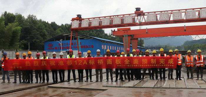 自去年10月份首件鋼板組合梁橋面板施工以來,項目部工程技術人員,堅持盯控現(xiàn)場,嚴把施工質量,對每一片都做好安全質量技術交底,施工過程記錄在案,以便質量跟蹤追溯。在吊裝運輸過程中,現(xiàn)場安全員、值班技術人員始終跟班作業(yè),周密組織、協(xié)調指揮。同時為加快推進節(jié)點進度,確保工程質量,對現(xiàn)場作業(yè)人員進行安全質量技術專業(yè)培訓,組建專業(yè)化施工隊伍,持證上崗,施工作業(yè)人員戰(zhàn)高溫、輪班倒,小雨不停歇,經過全體參建人員的共同努力,高效率圓滿完成預制任務。在慶祝鋼板組合梁橋面板預制完成儀式上,駐地辦高監(jiān)謝曉飛等監(jiān)理人員前來現(xiàn)場表示祝賀,對池祁12A標取得階段性成績表示肯定,并對橋面系后續(xù)施工提出了相關要求。
