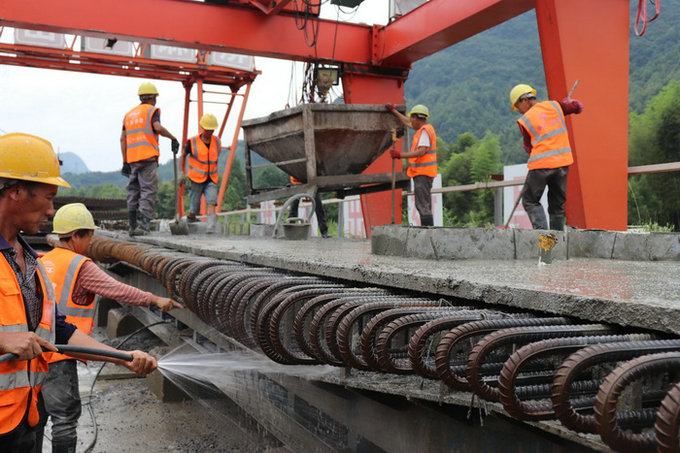 圖為員工慶祝鋼板組合梁橋面板預制完成 施工過程中,由于現(xiàn)場施工質量受操作人員技術素質影響大,而且受中孔道壓漿質量難以檢查和控制等因素制約,為有效解決施工難點,施工中將標準化、規(guī)范化貫穿全過程,嚴把施工工藝和工序及原材料質量關,不斷優(yōu)化施工組織,強化砼配合比試驗控制,采集最佳數(shù)據(jù),利用蒸汽養(yǎng)生,有效提高了工程質量,張拉和震搗中堅持專人負責、專人控制,減少人為因素導致的差異,確保了砼質量穩(wěn)定,大大提高了成品率。