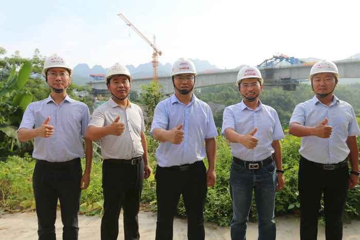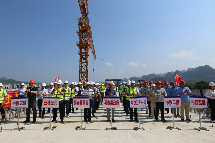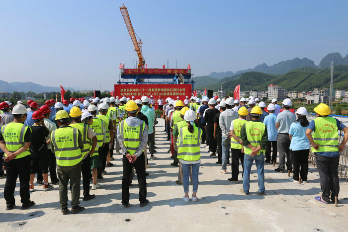 圖為合龍慶典儀式現(xiàn)場??????? 貴南高鐵項目沿線均為喀斯特地貌,溶洞、暗河密布,給橋梁樁基施工帶來了很大困難,尤其是對純混凝土大跨度橋梁,在沒有加勁拱、鋼管拱保持橋面線型穩(wěn)定的情況下,是對建橋施工技術的巨大突破。
