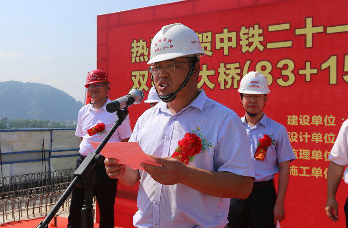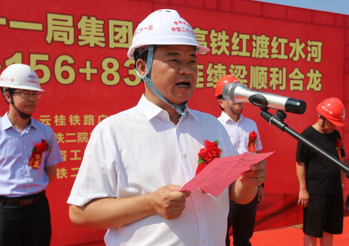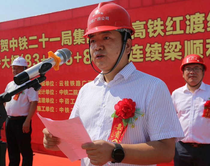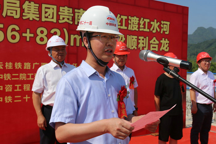 合龍慶典儀式,由中鐵二十一局集團貴南高鐵8標項目部常務副經(jīng)理衛(wèi)福星主持。首先由項目經(jīng)理池平平致辭,然后由一工區(qū)經(jīng)理張杰代表參建員工發(fā)言。中鐵二院南寧橋梁處處長韋國華、云貴鐵路廣西有限公司貴南高鐵建設指揮部指揮長周軍偉、都安縣政府黨組成員、貴南高鐵都安段征拆指揮部常務副指揮長藍景生、中鐵二十一局集團公司黨委副書記、工會主席田愛平先后在合龍儀式上作了講話。