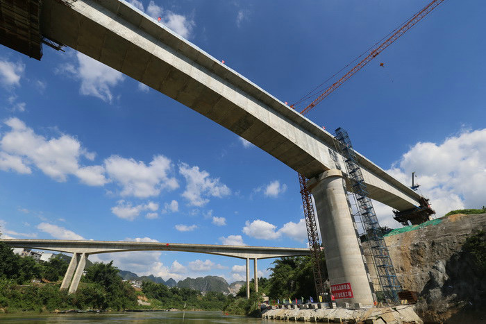 貴南高鐵紅渡紅水河雙線特大橋,位于廣西壯族自治區(qū)馬山縣與都安瑤族自治縣交界處,全長5776米,橋寬12.6米,橋面至河面高度達70米。飛跨紅水河主河道的主橋,設計為一聯(lián)長達323.8米的純混凝土連續(xù)梁,其中99#至100#主跨為156米,是我國時速350公里的高速鐵路中,跨度最大的預應力混凝土連續(xù)梁橋,被列為貴南高鐵全線的關鍵控制性工程之一。經(jīng)過施工、設計和科研單位協(xié)同攻關,戰(zhàn)勝了高溫、雨季和疫情的干擾,在不中斷通航的前提下,按期實現(xiàn)高精度對接合龍,為我國在喀斯特地貌區(qū)域,特殊地質條件下超大跨度混凝土連續(xù)梁在科研、設計和技術創(chuàng)新方面積累了寶貴的經(jīng)驗。