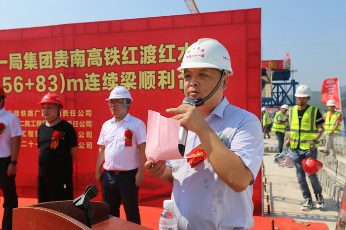 項目經(jīng)理池平平致辭 上午10時,為祝賀紅渡紅水河雙線特大橋順利合龍,項目部舉行了簡單而隆重的慶祝儀式。專程前來參加合龍儀式的嘉賓有:云桂鐵路廣西有限公司貴南高鐵建設指揮部指揮長周軍偉、都安縣政府黨組成員、貴南高鐵都安段征拆指揮部常務副指揮長藍景生、馬山縣征拆辦副主任、貴南高鐵馬山段征拆指揮部主任陸宇、中鐵二院南寧橋梁處處長韋國華、中咨工程管理咨詢有限公司貴南高鐵項目部監(jiān)理部總監(jiān)許孟喜、中鐵二十一局集團公司黨委副書記、工會主席田愛平、中鐵二十一局集團公司工會工作部部長余霞、中鐵二十一局三公司工會主席周普華;中鐵二十一局貴南8標段項目部、以及下屬各工區(qū)參建員工共計300多人到現(xiàn)場祝賀。