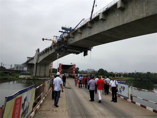 項(xiàng)目總工程師張生彥為他們?cè)敿?xì)介紹了高鐵建設(shè)的進(jìn)展情況,介紹了高鐵建設(shè)的新技術(shù)、新工藝。目前亳州特大橋跨渦河連續(xù)鋼構(gòu)拱已經(jīng)施工到19號(hào)塊段,20號(hào)塊段為合攏段,預(yù)計(jì)9月底可完成全橋合攏,勝利在望,目前項(xiàng)目部做好最后沖刺的準(zhǔn)備。