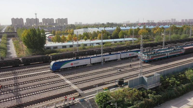 圖為兩萬噸重載列車在肅寧北站場(chǎng)等待發(fā)車