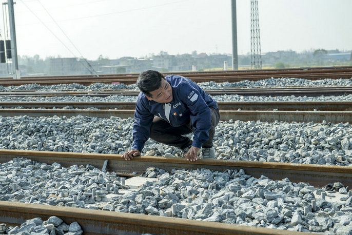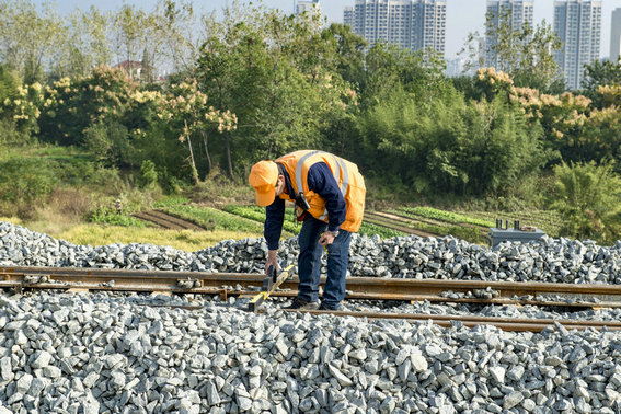 技術(shù)工作人員在檢查軌距和水平是否達(dá)到了標(biāo)注的尺寸