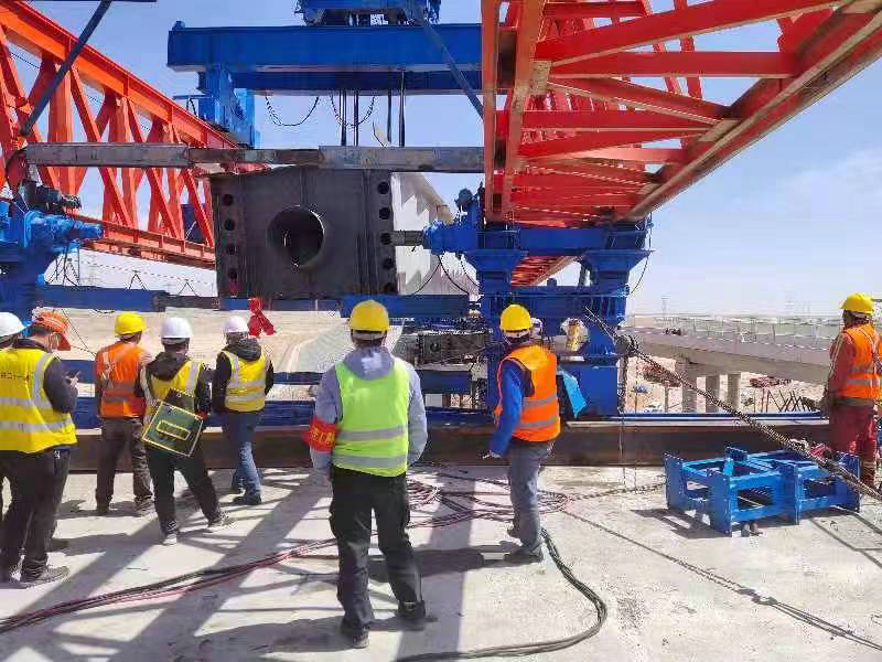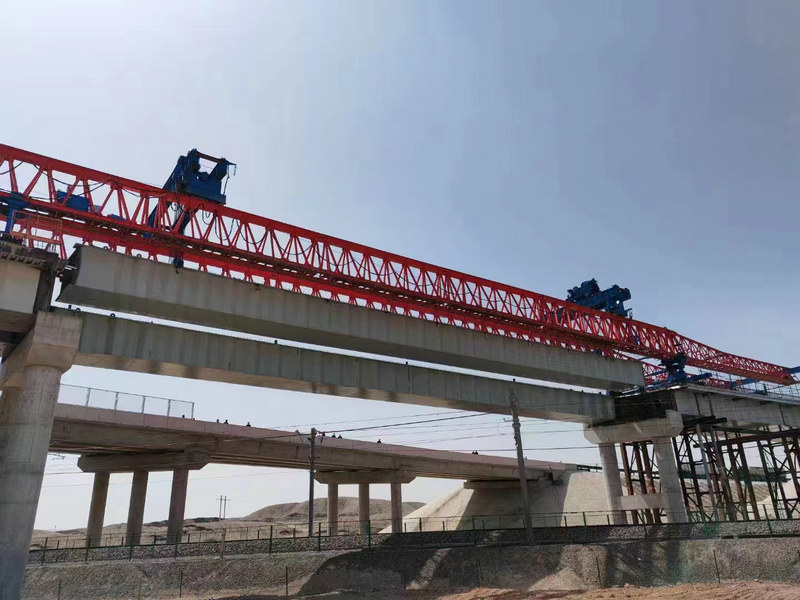 本次架梁施工采用QJ300-50 A3門式架橋機(jī),架橋機(jī)額定起重量300t,架梁跨度50m,為了保證架橋作業(yè)順利進(jìn)行,中鐵二十一局五公司七墩至瓜州公路上跨蘭新鐵路公鐵立交橋項(xiàng)目部認(rèn)真組織,加強(qiáng)人力、物資和機(jī)械等資源配置,分析各種風(fēng)險(xiǎn)源,制定相應(yīng)的應(yīng)急安全卡控措施。積極主動(dòng)與運(yùn)輸、設(shè)備和監(jiān)管部門通力合作,克服各種不利因素,嚴(yán)格按照封鎖計(jì)劃和施工方案有序組織施工,把施工對(duì)鐵路運(yùn)輸?shù)挠绊懡档搅俗畹?,安全、高效完成了跨鐵路架梁施工任務(wù)。