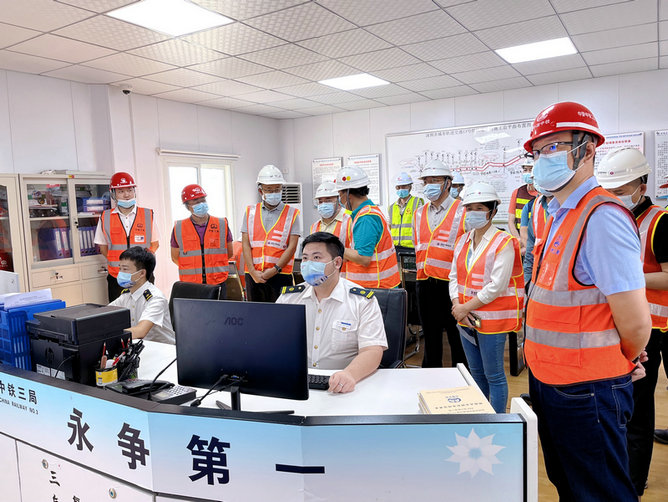 2022年10月16日,深圳市發(fā)展和改革委員會(huì)副主任鄭鐵軍蒞臨深圳地鐵13號(hào)線后?;卣{(diào)度中心檢查指導(dǎo)工作,港鐵中鐵電化軌道交通(深圳)有限公司總經(jīng)理孟榮輝、副總經(jīng)理吳啟中、安全總監(jiān)蔡偉森,中鐵三局集團(tuán)線橋有限公司工會(huì)主席邸向軍,項(xiàng)目經(jīng)理劉志權(quán)、項(xiàng)目運(yùn)輸副經(jīng)理?xiàng)铊吹认嚓P(guān)負(fù)責(zé)人陪同檢查。