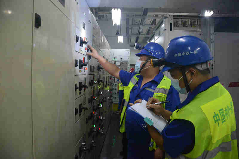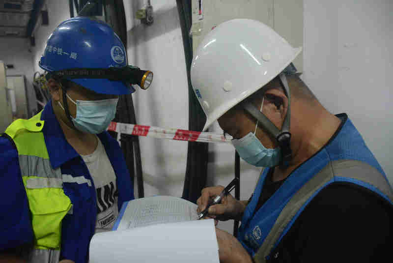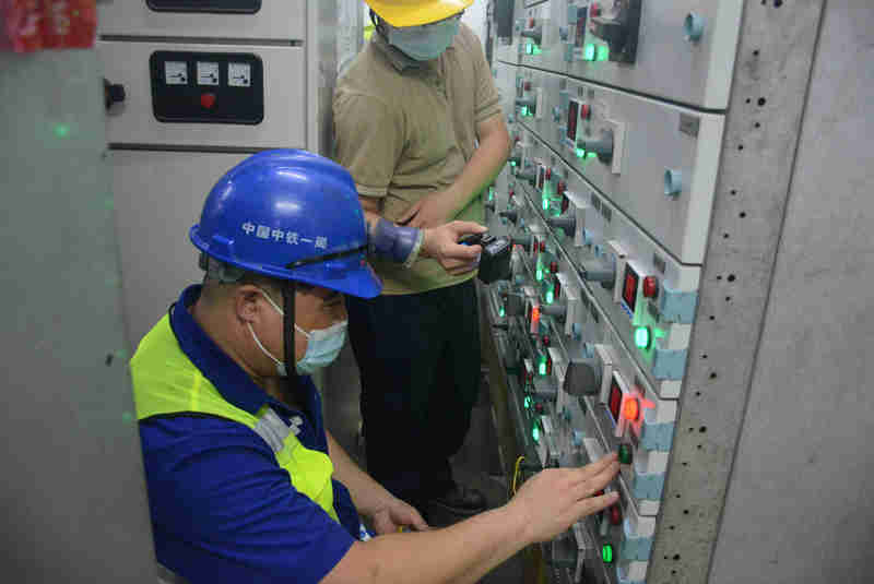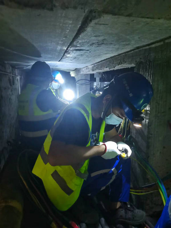 在有限空間作業(yè)時,項目部嚴(yán)格履行“作業(yè)審批制度”,對施工人員進行專項安全教育培訓(xùn),要執(zhí)行“先通風(fēng)、再檢測、后作業(yè)”原則,現(xiàn)場還要配備有專人負(fù)責(zé)監(jiān)護工作。施工中,作業(yè)人員鉆進塵封多年的地下夾層,布滿線纜的狹窄空間讓人寸步難行,積了近一厘米厚的灰塵迅速在空氣中彌漫開來,嗆得人無法呼吸,作業(yè)人員貓腰弓身,屏息凝神,用力將一根根粗重的電纜接入到地上的過渡配電柜中,頓時滿頭大汗,漂浮的灰塵迅速粘黏在他們的臉上和身上。與此同時,守在配電柜旁的一人與地下夾層人員緊密配合,快速將接入的電纜進行配線安裝。因為低壓柜配線需要地鐵停電作業(yè),而既有線停電請點十分困難,必須在凌晨3:30送電前完成作業(yè),每個人都在爭分奪秒,與時間賽跑,緊張有序的完成每一道工序。