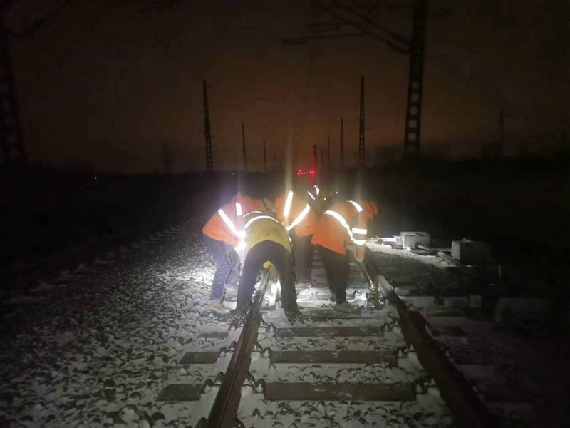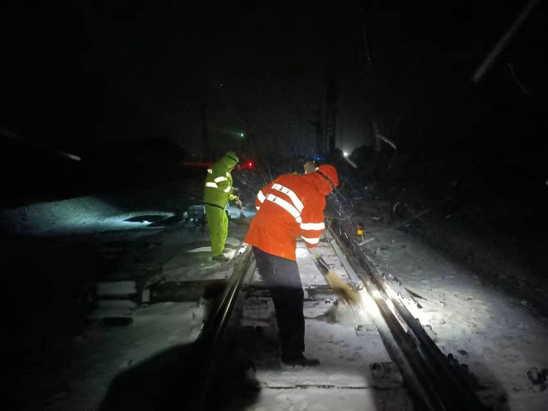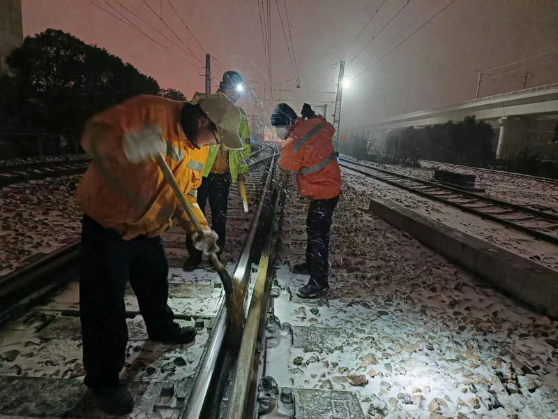 1月14日,皖西北地區(qū)迎來降溫、降雪過程,中國鐵路上海局集團有限公司阜陽工務(wù)段亳州線路車間為確保京九線列車運行安全暢通,自14日晚上到15日早上組織人員對各站場道岔進行掃雪、除凍。