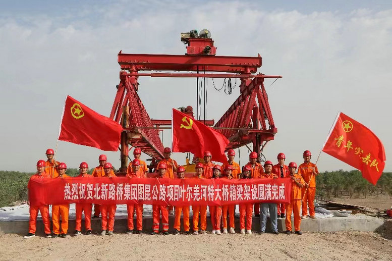 據(jù)該項目經(jīng)理董軍介紹,葉爾羌河特大橋是實現(xiàn)圖昆公路全線貫通的重要結(jié)構(gòu)物,也全線是開工最晚、工期最緊張的一個標段,面對國慶節(jié)通車總目標,項目部按照目標不變、任務(wù)不減、質(zhì)量不降,全力以赴挖潛力、搶進度,合理編排施工組織,優(yōu)化設(shè)計方案,克服風沙、酷暑等重重困難,根據(jù)特大橋工程量大、周期長等特點,合理安排了橋梁運輸、橋面作業(yè)等交叉工序,定人定崗把控工程安全質(zhì)量關(guān),開展節(jié)點考核,積極落實安全質(zhì)量、施工進度獎勵措施,充分調(diào)動了全體參建人員工作熱情和積極性,為整體施工進展贏得了寶貴時間。在300多名參建者共同努力下,圖昆二標項目橋梁下部結(jié)構(gòu)、箱梁預(yù)制及箱梁架設(shè)各節(jié)點全部超前完成施工任務(wù),跑出了品質(zhì)工程建設(shè)“北新速度”。