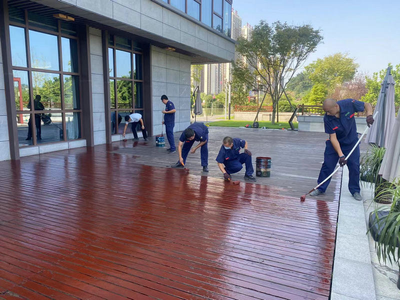 重慶合川訊(通訊員 蒲莎莎)為永葆北新鑄魂的合川草街青春永駐,2023年9月10日,重慶北新宜邦物業(yè)維養(yǎng)部展開了對北新·御龍灣售樓中心及周邊防腐木的維護及保養(yǎng)。