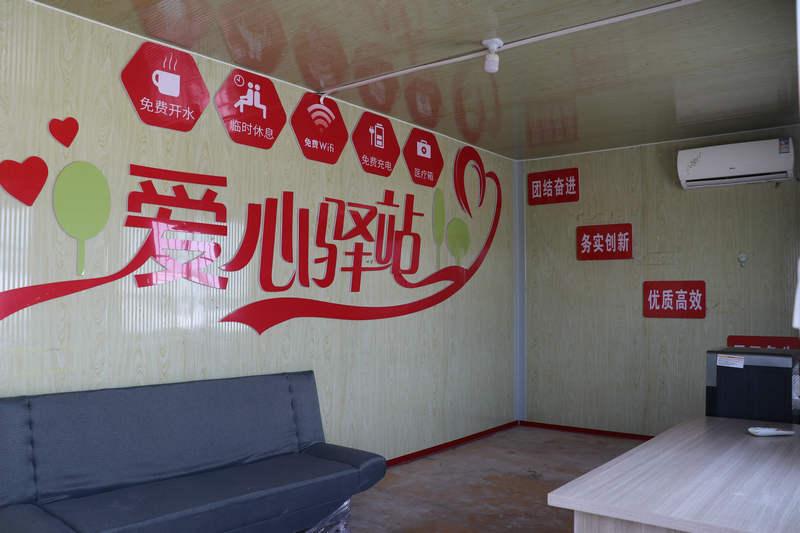 “瞧見(jiàn)沒(méi),咱項(xiàng)目新修了個(gè)愛(ài)心驛站,空調(diào)、飲水機(jī)、WIFI啥都有,以后休息就有地方了。”“是啊,夏天天氣熱,一出汗就口渴,這個(gè)驛站就在我們工作場(chǎng)地內(nèi),再也不用帶著大水壺跑了,來(lái)這里接水方便多了。”