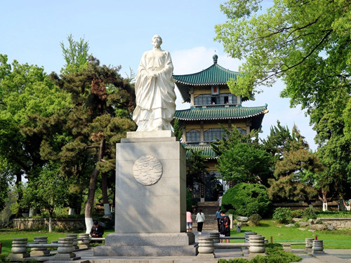 戰(zhàn)友們又來到行吟閣景點。行吟閣景點是為紀念愛國詩人屈原而建,位于湖北武漢市東湖西北岸聽濤軒東側(cè)小島上,它聳立于“荷風(fēng)”和“落羽”兩橋之間的湖島之上。閣高三層,綠瓦圓柱,精巧壯麗,具有民族風(fēng)格。四面環(huán)水,由新筑長堤上之荷風(fēng)橋通達。行吟閣1955年興建,取《楚辭·漁父》中屈原“行吟澤畔”之意命名。閣系鋼筋混凝土結(jié)構(gòu),仿古代磚木建筑形式,四角攢尖頂,飛檐三層,上覆翠瓦。檐下懸郭沫若手書“行吟閣”匾額。閣前豎有我國古代偉大詩人屈原的全身塑像。