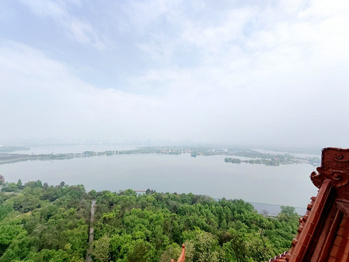 戰(zhàn)友們一行先行來到了楚天臺景點。楚天臺景點是東湖磨山楚文化游覽區(qū)內(nèi)的標志性建筑,可與江南三大名樓媲美。屹立于磨山第二主峰,仿古章華臺形制而建,高35.26米,樓頂安置1.2米高銅鳳一只,正面墻上鑲有用600多塊天然大理石拼成的“楚天仙境丹鳳朝陽”圖案,為楚天一絕。整樓面積2260平方米,外五內(nèi)六層,每天定時表演編鐘樂舞,展出楚國出土的大批文物復(fù)仿制品。站在高高的楚天臺上,可鳥瞰東湖全景。登樓遠眺,目及所處,盡收眼底,給人以心曠神怡之感。