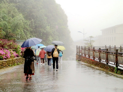 但面對(duì)老天爺?shù)牟焕斫猓覀円埠軣o(wú)奈。導(dǎo)游與我們商量,再等等看,看能否云開(kāi)霧散?雨還在下,不見(jiàn)變小,但云霧卻越來(lái)越濃,剛才還能看到的觀音臺(tái)、鶴壽頂?shù)染包c(diǎn),在大雨的督促下,稍瞬即逝,等了大約半個(gè)小時(shí)也不見(jiàn)好轉(zhuǎn)。手機(jī)上看了看當(dāng)日的天氣預(yù)報(bào),也不見(jiàn)好轉(zhuǎn)的跡象。