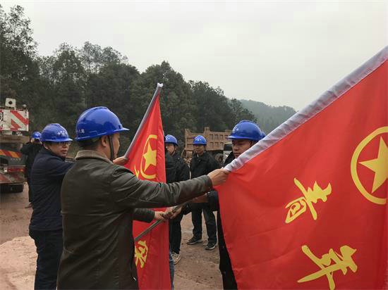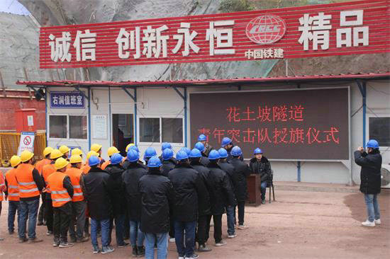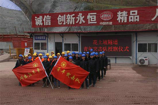 11月13日,渝黔項目部在花土坡隧道施工現(xiàn)場舉行了青年突擊隊授旗儀式,拉開了水壓爆破技術創(chuàng)新攻關的序幕。項目經理張貴倉、書記胡天佑分別為青年突擊隊授旗。