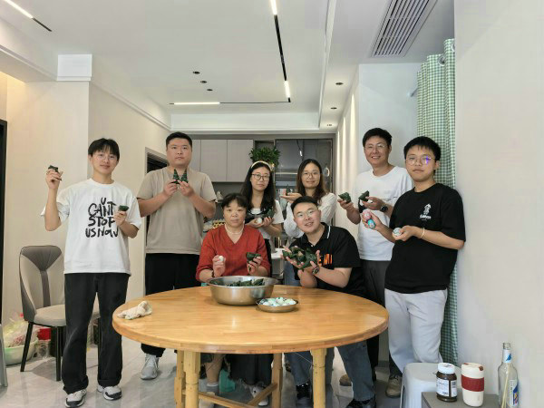 “來(lái)嘍!”隨著一聲吆喝,一張張?zhí)崆扒逑春玫聂杖~和提前泡好的糯米被端上了桌。項(xiàng)目職工們圍坐在餐桌旁摩拳擦掌、躍躍欲試,但由于大部分人都沒(méi)包過(guò)粽子,剛剛開(kāi)始的時(shí)候,粽子長(zhǎng)得是歪七扭八,引得大家互相吐槽,笑成一片。在有經(jīng)驗(yàn)的同志的教學(xué)下,大家慢慢地找到了訣竅,一個(gè)個(gè)粽子變得有棱有角、整齊漂亮起來(lái)。