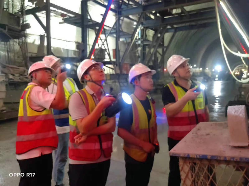項(xiàng)目黨支部書記韓崇生(右一)組織黨員干部安全質(zhì)量先鋒崗在中梁山隧道進(jìn)口“夜查”