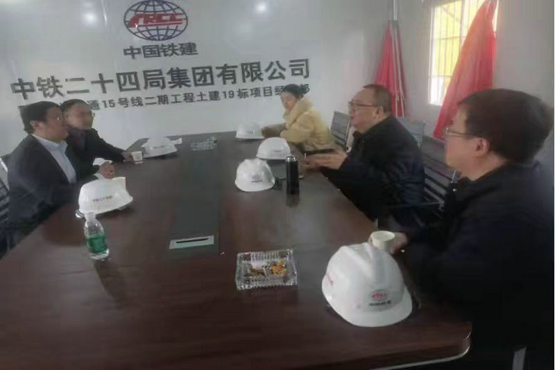 總承包部指揮長(zhǎng)李兵(右2)與分管軌道工程項(xiàng)目領(lǐng)導(dǎo)徐新明(左1)、項(xiàng)目經(jīng)理王磊(左2)