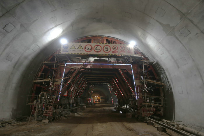 隧道二襯施工從岔口特大橋工地往山上眺望,“楊道塬隧道由中鐵二十一局三公司承建”兩排紅底白字的巨幅廣告牌,在藍(lán)天白云映襯下格外醒目,為深山里的黃土塬增添了一抹亮色。沿著陡峭的盤山便道蜿蜒上行,就是楊道塬隧道出口。洞口正在澆筑仰拱,進(jìn)入洞內(nèi),已二襯的隧道拱頂和邊墻泛著清水混凝土本色,無(wú)錯(cuò)臺(tái)和蜂窩麻面,外觀質(zhì)量好。隧道掌子面上,幾名身穿紅黃反光背心的工人在上道坑梯子上,用鐵锨鏟起拱線和拱頂?shù)狞S土。隧道施工隊(duì)負(fù)責(zé)人說(shuō):“左洞已掘進(jìn)180米,右洞120米,施工進(jìn)展順利,保證按期貫通沒有問題。”