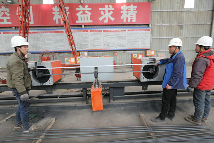 圖為技術(shù)人員檢查數(shù)控彎曲機(jī)加工鋼筋精度