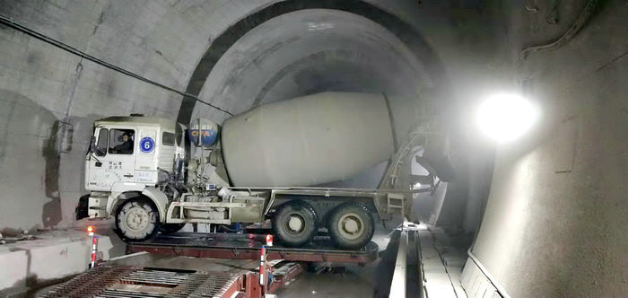 在隧道內(nèi)調(diào)頭,對于大型重載卡車十分困難,直接影響到出碴、澆筑無砟軌道等施工進(jìn)度。由中鐵二十一局三公司承建的重載運(yùn)煤專線蒙華鐵路小南塬隧道全長7067.2米,其寬度比一般高鐵、高速公路隧道窄一兩米以上,重型卡車在洞內(nèi)調(diào)頭十分困難。尤其是在無砟軌道施工中,除去隧道兩邊已澆筑排水溝、電纜槽,其地面空間只剩7米,而大型砼罐車長達(dá)9.1米,只有開著進(jìn)去、倒著出來。