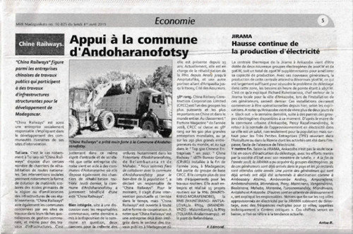 近日,馬達加斯加主流媒體MIDI稱贊中鐵十八局集團馬達加斯加公司是一家具有高度社會責任感的公司,為當地人民提供了諸多幫助。多年來,中鐵十八局集團馬達加斯加公司在建好項目的同時,多次無償為附近學校捐贈學習用品,幫助清理學校場地,維護公共基礎設施。日前義務為承建的塔娜市政工程附近村鎮(zhèn)清理生產生活垃圾,使村鎮(zhèn)居民的生活環(huán)境更加舒暢清潔。