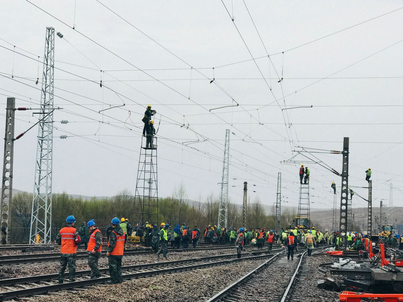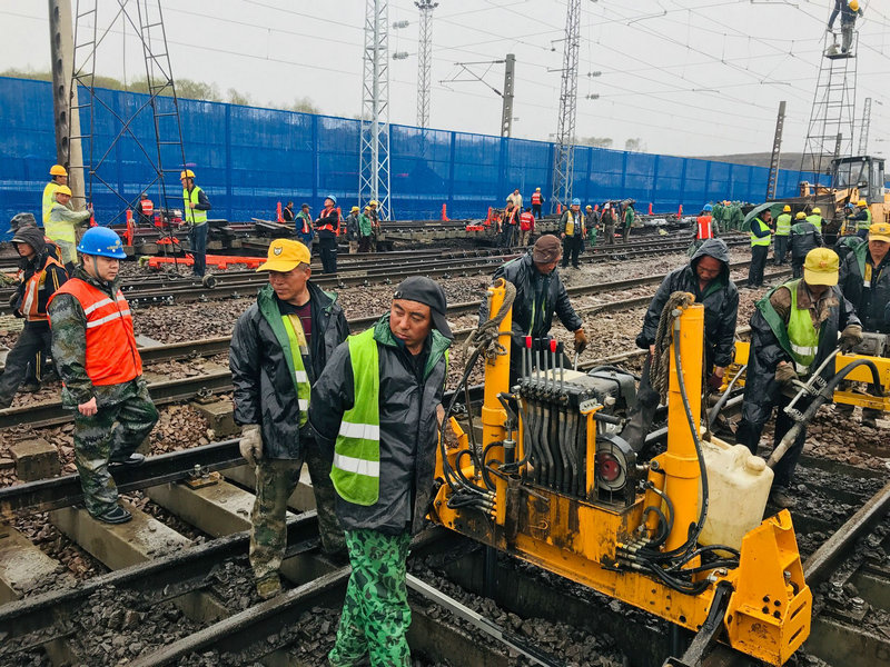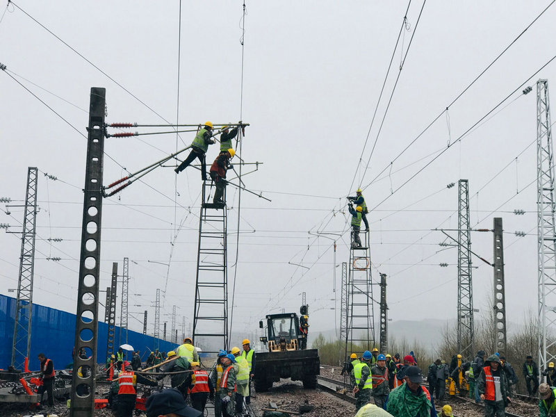 既有線施工保安全,點(diǎn)內(nèi)施工保正點(diǎn)。岢嵐,昨天21:25時(shí)起,下著大雨。4:50時(shí),大家冒著大雨向封鎖施工現(xiàn)場(chǎng)集結(jié)。5:16時(shí),施工現(xiàn)場(chǎng)290余名參戰(zhàn)人員精神抖擻,嚴(yán)陣以待。7;06時(shí),項(xiàng)目再一次現(xiàn)場(chǎng)全員點(diǎn)名,進(jìn)一步明確目標(biāo)任務(wù),Ⅲ級(jí)要點(diǎn)施工大會(huì)戰(zhàn)即將打響。8:00時(shí),封鎖命令下達(dá)。參戰(zhàn)的各施工作業(yè)隊(duì)人員和機(jī)具快速就位,迅速撲向撥接線路,進(jìn)入既定崗位。8:01時(shí),現(xiàn)場(chǎng)安全防護(hù)、巡查、盯控人員聚精會(huì)神地觀察、確認(rèn)每一個(gè)作業(yè)環(huán)節(jié)。8:02時(shí),各施工隊(duì)嚴(yán)格按照預(yù)定方案進(jìn)行,施工作業(yè)人員兵分九路,防護(hù)、吊裝、拆除、插岔、撥道、搗固、換裝、調(diào)整、試驗(yàn)同時(shí)交叉作業(yè),嚴(yán)格按照預(yù)定方案進(jìn)行。8:06時(shí),寧岢鐵路安塘“一站一線”和線路撥接點(diǎn)機(jī)具轟鳴,掀起了集中會(huì)戰(zhàn)的施工熱潮。8:15時(shí),扒道砟聲、切割軌道聲、抬鋼軌的號(hào)子聲、機(jī)器轟鳴聲此起彼伏。8:56時(shí),新10號(hào)道岔順利插入。10:45時(shí),道岔新線與既有線實(shí)現(xiàn)聯(lián)結(jié)。11:06時(shí),信號(hào)新微機(jī)聯(lián)鎖、通信、信號(hào)、接觸網(wǎng)開通啟用。11:25時(shí),根據(jù)“工完料凈,人走場(chǎng)清”要求。施工完畢后,項(xiàng)目安全防護(hù)員對(duì)現(xiàn)場(chǎng)內(nèi)外進(jìn)行仔細(xì)檢查確認(rèn),對(duì)施工廢棄物、遺留工具或垃圾及時(shí)清理干凈。11:38時(shí),施工人員全部安全撤出現(xiàn)場(chǎng),為本次“天窗”施工畫上圓滿的句號(hào)。12:00時(shí),安塘站調(diào)度室下達(dá)施工結(jié)束令,封鎖施工順利完成,安全正點(diǎn)實(shí)現(xiàn)了線路開通。