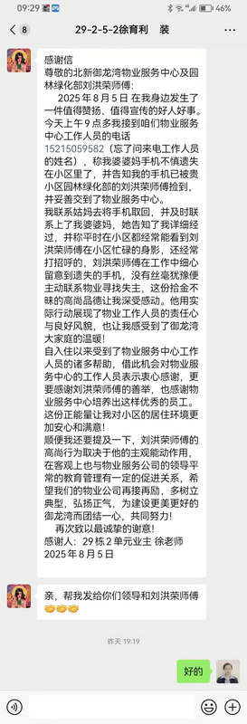 物業(yè)服務(wù)中心項(xiàng)目二部主管接到手機(jī)后,通過(guò)手機(jī)內(nèi)的 “敬老卡” 信息,迅速鎖定失主為三街區(qū) 29-2-5-2 的徐育利,并及時(shí)聯(lián)系其前來(lái)領(lǐng)取。當(dāng)徐育利得知撿到手機(jī)的是平日工作認(rèn)真負(fù)責(zé)、待人熱情的劉洪榮師傅時(shí),難掩激動(dòng)之情:“劉師傅平時(shí)修剪園林就一絲不茍,這次還主動(dòng)歸還手機(jī),太讓我感動(dòng)了!” 當(dāng)晚,便寫(xiě)下感謝信,為劉洪榮的善舉點(diǎn)贊,也向北新宜邦物業(yè)培養(yǎng)出這樣的優(yōu)秀員工致謝。?