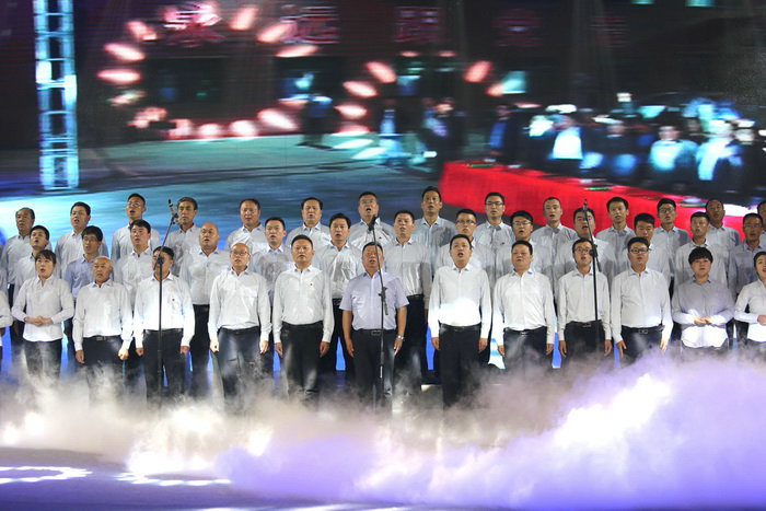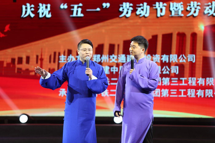 大合唱《鐵道兵志在四方》 精彩的文娛節(jié)目表演獲得了觀眾一陣又一陣的熱烈掌聲,演出結(jié)束后,各位領(lǐng)導(dǎo)與演職人員合影。勞模頒獎(jiǎng)文娛晚會(huì)使用微信平臺(tái)直播,收到了良好的宣傳效果。頒獎(jiǎng)晚會(huì)由鄭州交通建設(shè)投資有限公司、鐵建中原工程有限公司、中鐵二十一局三公司聯(lián)合主辦,由中鐵二十一局三公司滎陽(yáng)G234項(xiàng)目部承辦。