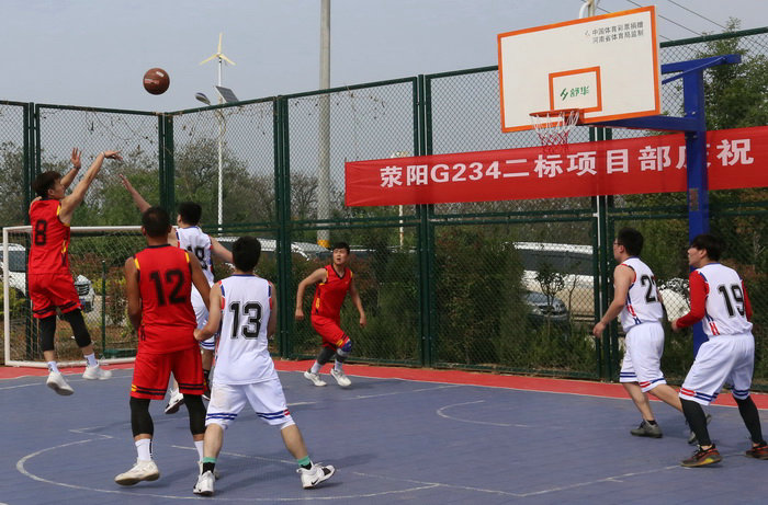 鄭州交通建設(shè)投資有限公司領(lǐng)導(dǎo)為勞模贈(zèng)書(shū) 根據(jù)活動(dòng)安排,下午14時(shí),在滎陽(yáng)G234項(xiàng)目部舉行了職工籃球友誼賽,鄭州交通建設(shè)投資有限公司、中鐵二十一局三公司滎陽(yáng)G234項(xiàng)目部、中鐵二十一局三公司鄭州310項(xiàng)目部各組建一支球隊(duì),監(jiān)理、設(shè)計(jì)、第三方檢測(cè)單位、第三方造價(jià)咨詢單位組建聯(lián)合球隊(duì),共四支隊(duì)伍參賽。鄭州交通建設(shè)投資有限公司、公司領(lǐng)導(dǎo)、勞動(dòng)模范,鐵建中原公司職工代表、國(guó)道310項(xiàng)目部、滎陽(yáng)G234項(xiàng)目部及工區(qū)、施工隊(duì)人員觀看了比賽。四支球隊(duì)經(jīng)過(guò)三場(chǎng)3個(gè)多小時(shí)的角逐,鄭州交通建設(shè)投資有限公司籃球隊(duì)獲得第一名、第二名為滎陽(yáng)G234項(xiàng)目部、國(guó)道310項(xiàng)目部、聯(lián)合球隊(duì)并列第三。