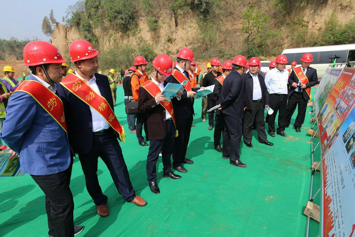勞模宣講進(jìn)入工地現(xiàn)場(chǎng) 上午9時(shí),中鐵二十一局三公司總經(jīng)理、黨委副書(shū)記李光軍、公司黨委副書(shū)記、紀(jì)委書(shū)記郝禮、公司副總經(jīng)理魏惠民、公司副總經(jīng)理張驊、公司副總經(jīng)理雷榮仁、公司工會(huì)主席周普華和公司十大勞模在G234滎陽(yáng)項(xiàng)目部觀看G234項(xiàng)目全線沙盤(pán)模型,由公司副總經(jīng)理兼項(xiàng)目經(jīng)理雷榮介紹了工程概況及施工情況。