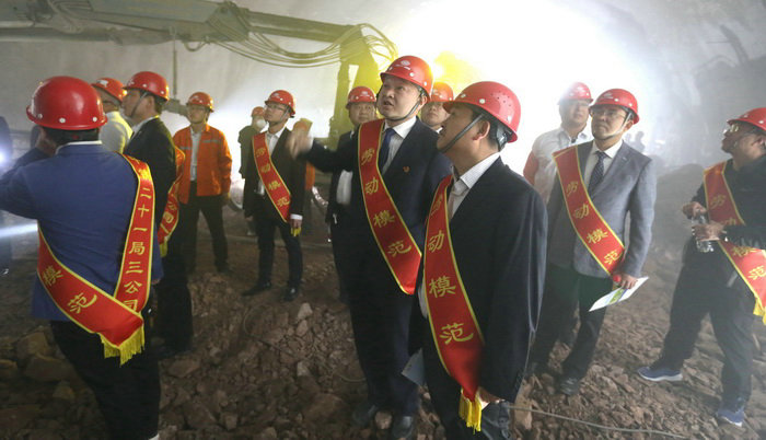 圖為勞模們進(jìn)入萬(wàn)山隧道掌子面參觀