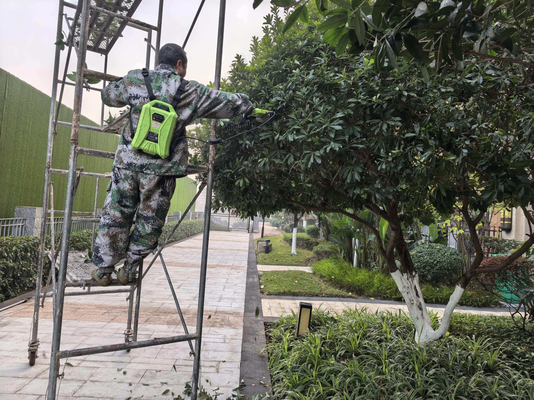 在小區(qū)22棟旁的綠化區(qū)域,身著統(tǒng)一迷彩服的養(yǎng)護(hù)工作人員各司其職、默契配合,成為寒冬里最亮眼的風(fēng)景線。他們熟練搭建起金屬腳手架,背上亮綠色的電動(dòng)工具包,手持高枝剪、修枝鋸等專業(yè)器械,重點(diǎn)對園區(qū)內(nèi)大型喬木、造型灌木及景觀桂花樹展開精細(xì)化修剪。站在數(shù)米高的腳手架上,工作人員穩(wěn)穩(wěn)托住枝干,目光專注地精準(zhǔn)剪除過密枝、徒長枝、病弱枝與枯萎枝,既為樹木調(diào)整出通風(fēng)透光的合理樹冠結(jié)構(gòu),又依據(jù)景觀需求塑造出整齊美觀的造型;地面上的同事同步跟進(jìn),迅速清理剪下的枯枝敗葉,分類打包、及時(shí)清運(yùn),確保作業(yè)區(qū)域環(huán)境整潔,杜絕枝葉堆積影響業(yè)主通行安全。